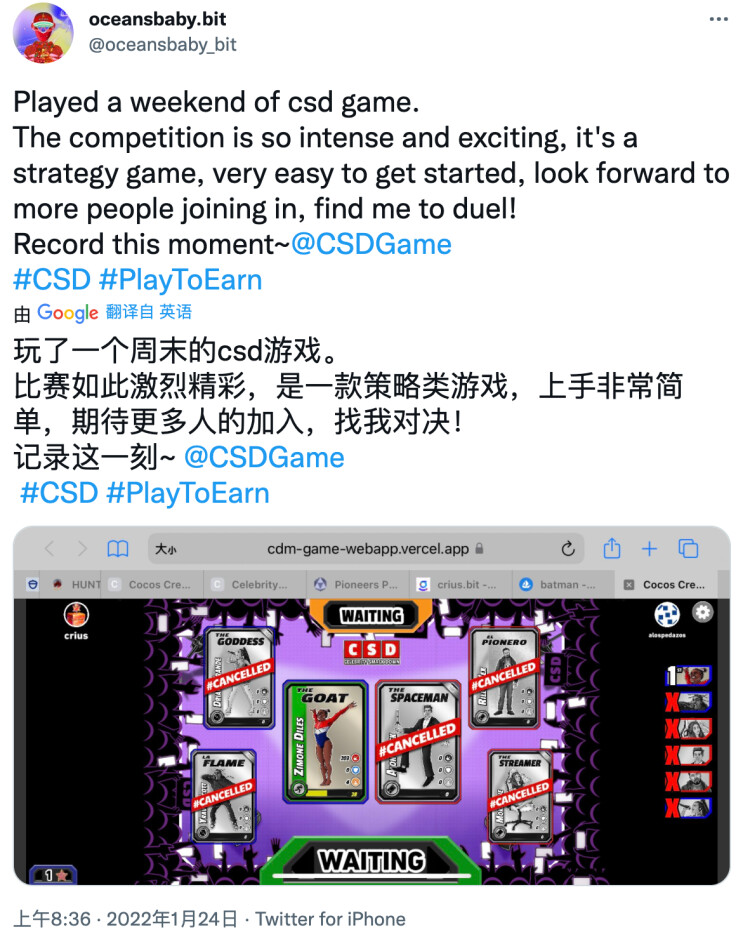 CSD 的 NFT 所代表的这些卡牌与所模仿名人的推特进行关联。如此我们让这些 CSD NFT 有办法根据名人获得的粉丝数量改变其能力等级等特性,从而影响它们在游戏中的效用。