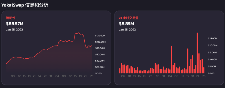 数据方面,自 YokaiSwap 上线以来流动性以及交易量信息如下图所示: