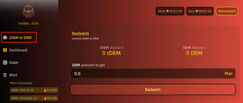铸造 DRM 代币时,用户需要投入已经被国库接受的加密资产,然后才能收到折价的 DRM。我们可以将 DRM 类比成债券,这些债券定期支付利息( 8 小时),并有一个特定的到期时间(5 天)。收益可以继续作为投入,从而实现复利增长。国库中的加密资产会被用于 DeFi 挖矿,从而获得更多的收益和增加 DRM 代币的基础价值。