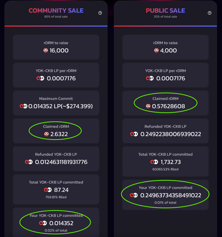 如果你看到的 rDRM 的数量为 0,那么十有八九是你没有参加成功,可到 YokaiSwap 的 Launchpad 页面核对你提交的 LP 信息,如下图所示:
