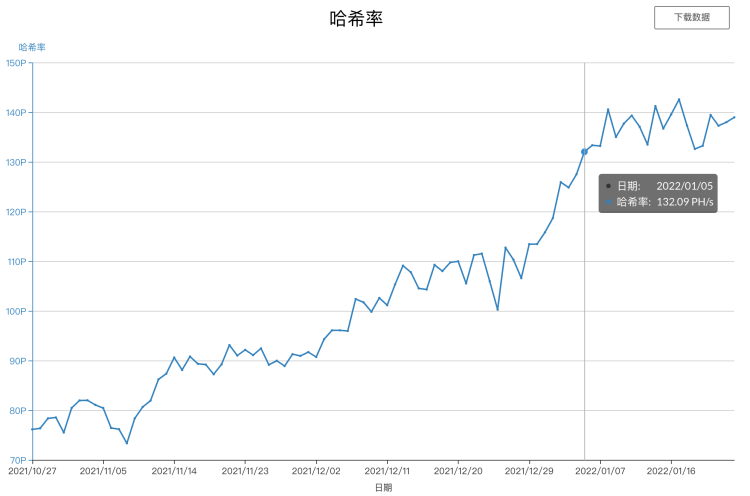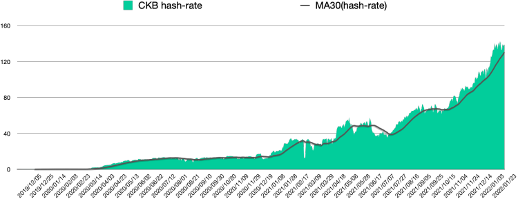 下图是 CKB 主网上线以来的全网算力走势图,从 2019/11/16 至今,算力从最初的 0.073 P 增长到如今的 140+ P,算力增长近 2,000 倍。