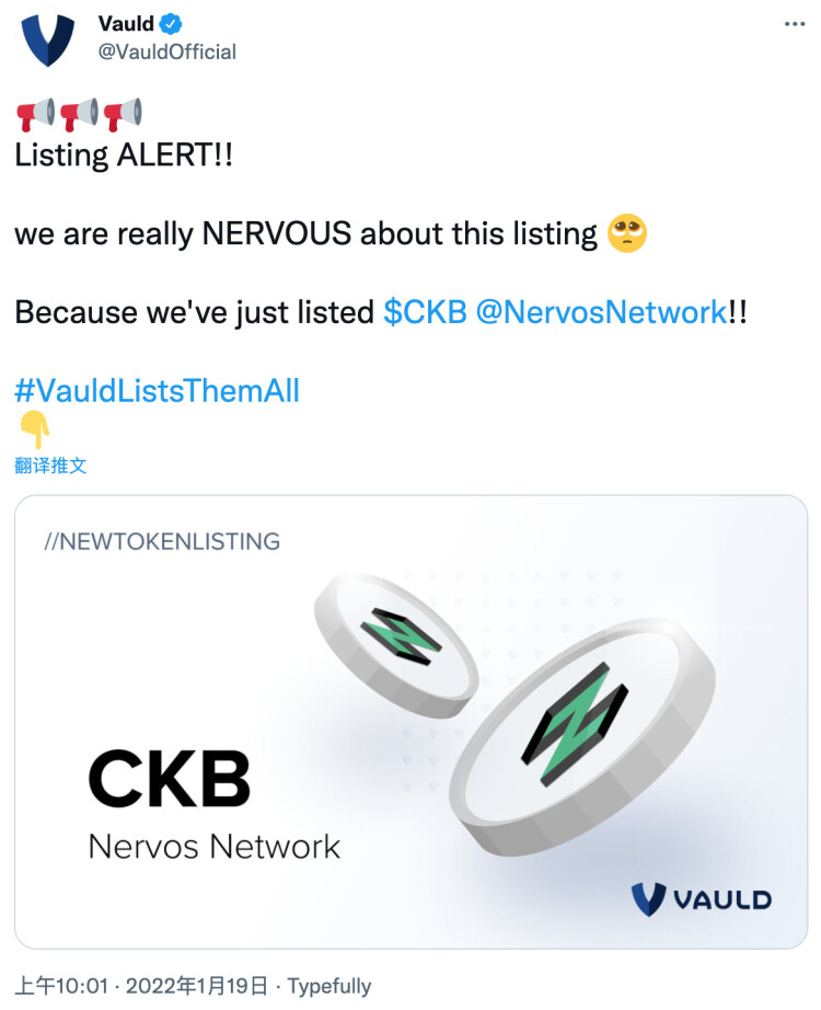 上周,CKB 被 Listing 到 Vauld,可以使用 USDT、印度卢比(INR) 来购买 CKB 。