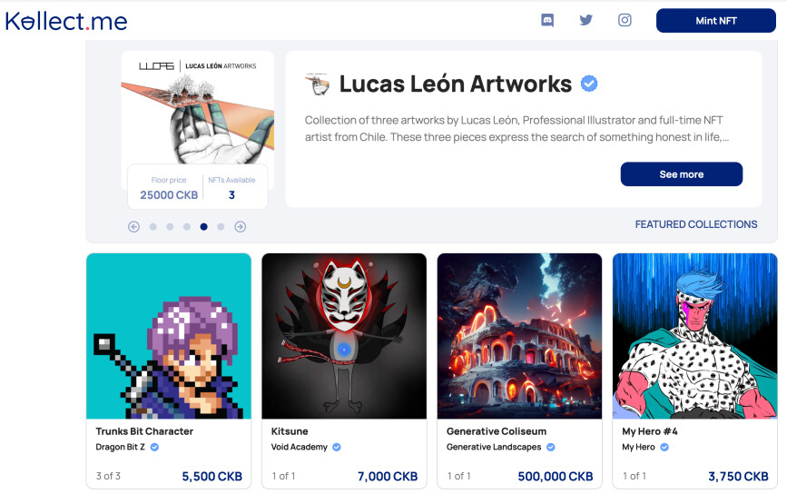 kollect.me 项目是 CKB 上第一个既有 NFT 铸造,又有二级市场的平台,类似 OpenSea。用户通过 UniPass 邮箱注册账号登录,就可以获得自己的 CKB 地址,然后铸造 NFT,并且在该平台上销售。