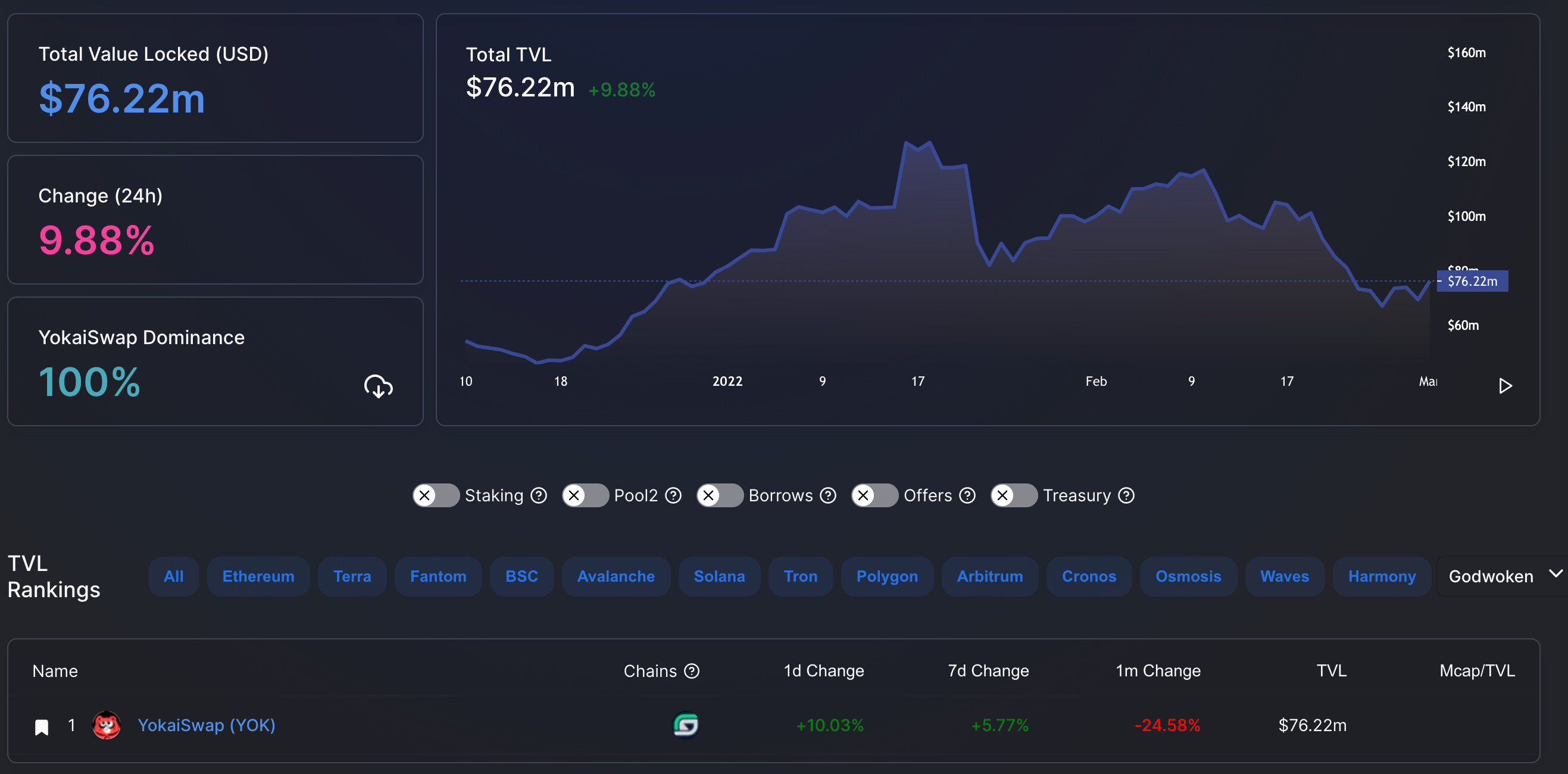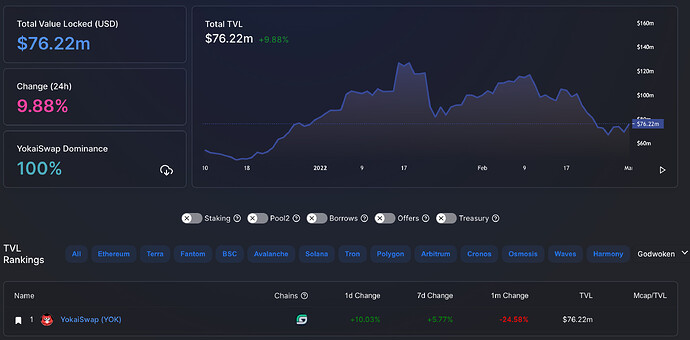 上期本刊发布时的 TVL 是$72.68 M,7 日变化 5.77%,30 日变化 -24.58%。 Godwoken 上的更多数据, 可以通过以下链接查看: https://defillama.com/chain/Godwoken。(为什么说是不完全统计数据:目前在 Godwoken 主网上除了 YokaiSwap 之外,还有 Daruma(不倒翁)、Hadouken(波动拳),而仅有 YokaiSwap 的数据被收录到 DefiLlama 上 )