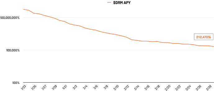 再来看看 $DRM 的年化收益,一天自动复利 3 次,当前年化为 212,470%。