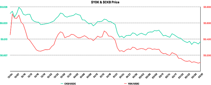 我们来对比一下 YOK 与 CKB 的价格走势,绿色为 CKB 的走势图,红色为 YOK 的走势图,可以看到,基于法币本位的视角来看,除了 YOK 刚上线时一周左右的时间外,后面的时间基本与 CKB 的走势很像。