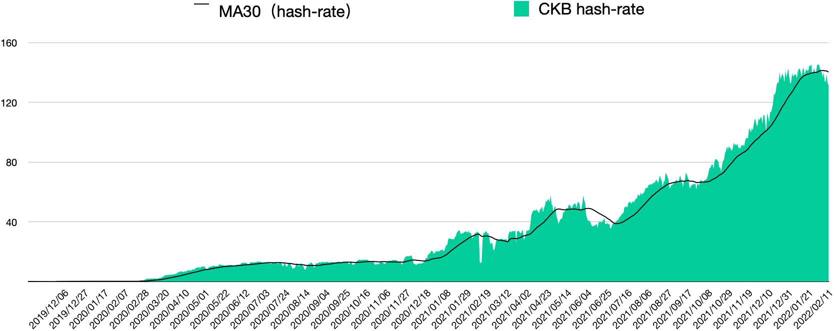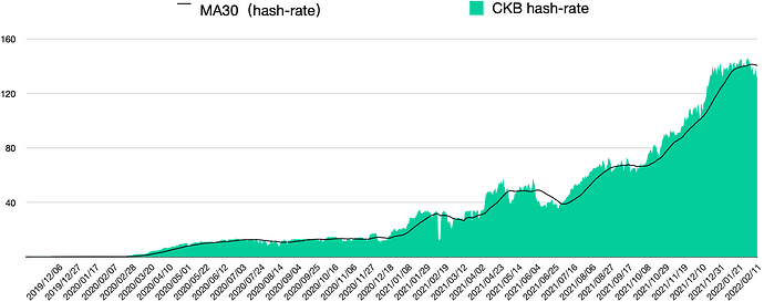 下图是 CKB 主网上线以来的全网算力走势图,从 2019/11/16 至今,算力从最初的 0.073 P 增长至今,日间算力最高的时候超过 150P,算力增长超过 2,000 倍。