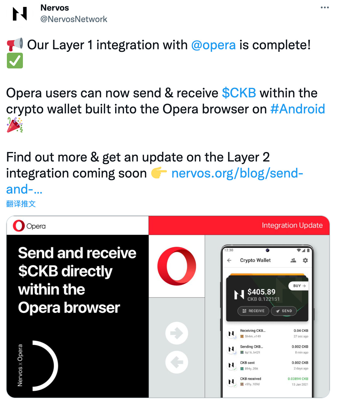 上周,Opera 与 Nervos 共同宣布了 Opera 完成了对 Nervos 网络 Layer 1的集成,也即 CKB 层的集成。Opera 用户可以在浏览器钱包里收发 CKB。同时,对于二层的集成也正在展开。
