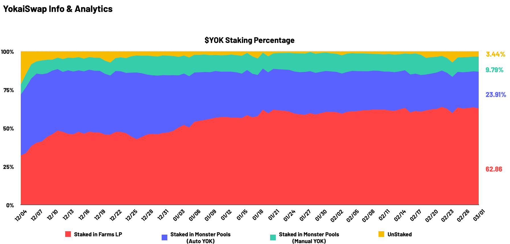 上图为 YokaiSwap 上线以来的质押图,其中红色部分为锁到农场里的 YOK,蓝色为锁定到自动资金池中的 YOK,绿色为锁定到手动资金池中的 YOK,最后黄色这部分为未锁定的 YOK。