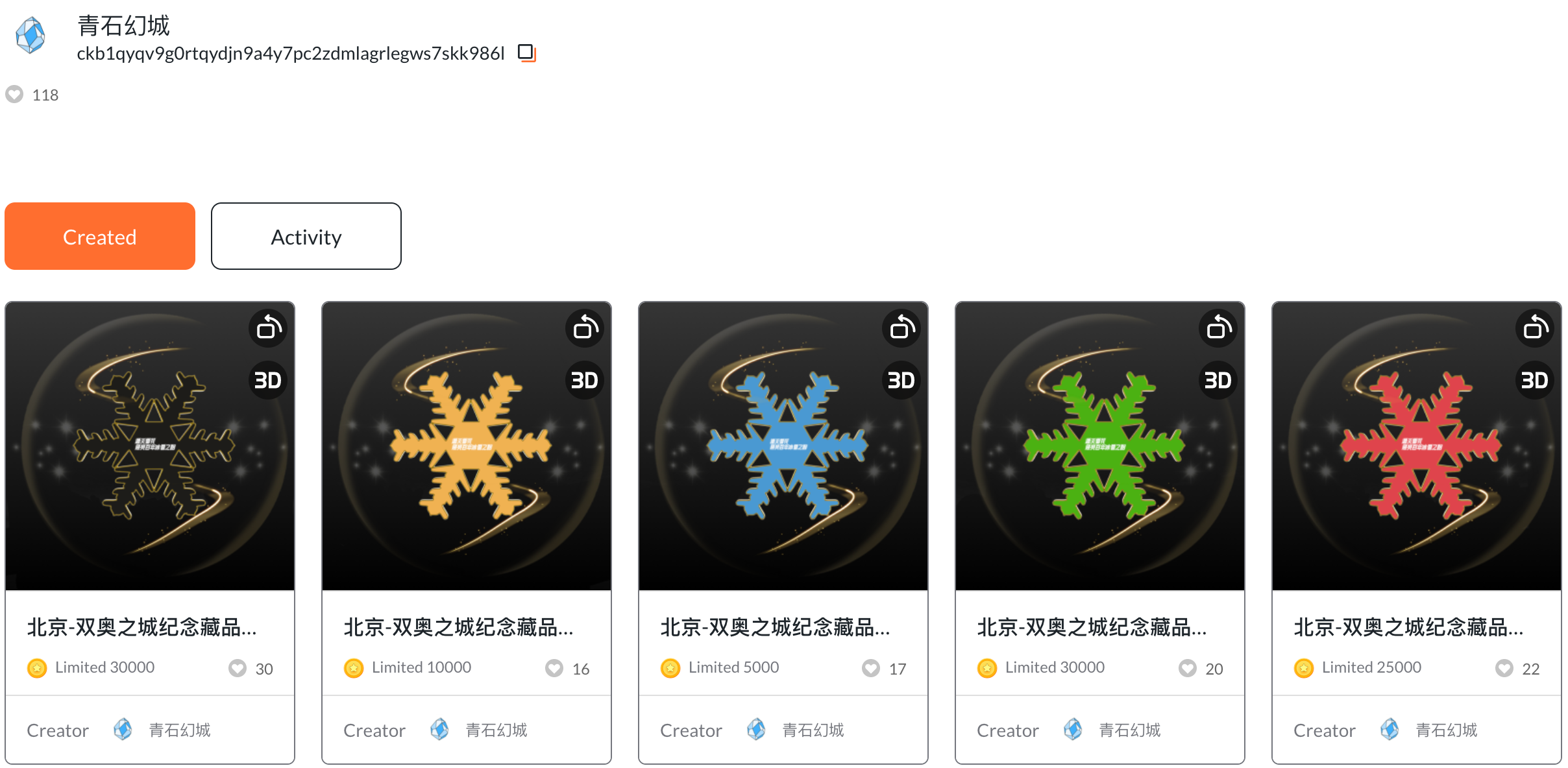 同时,为庆祝北京成功举办了2008奥运会和2022冬奥会成为双奥之城,上海浦东新区科幻协会联合国家体育总局体育文化发展中心、中国奥林匹克博物馆、2022北京冬奥文化活动赞助商文投控股等,共同推出“漫天雪花照亮百年冰雪之路”冬奥线上文化活动,本次“北京-双奥之城五彩雪花3D盲盒NFT”由青石幻城发行。这个系列分别发行了黑色、黄色、蓝色、绿色、红色,5种颜色的雪花,分别对应奥运五环的五种颜色,详情:https://explorer.mibao.net/issuer/tokens/70821dad-ecbf-4793-b647-c998e04fe94a