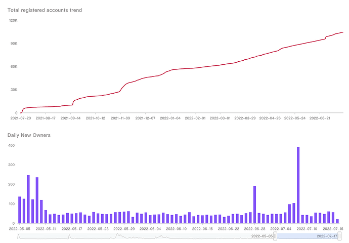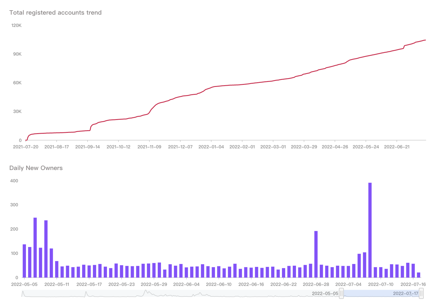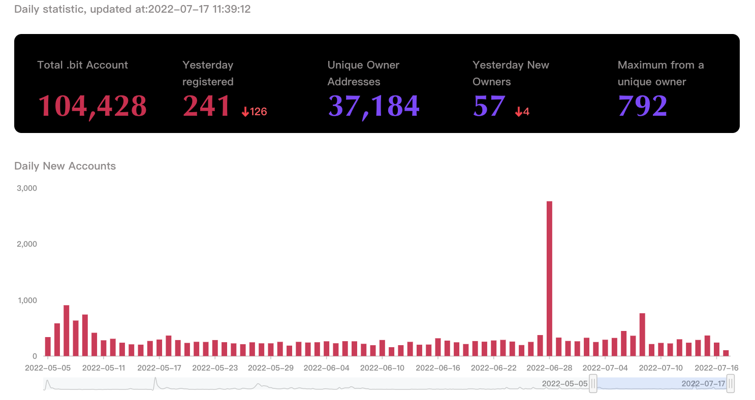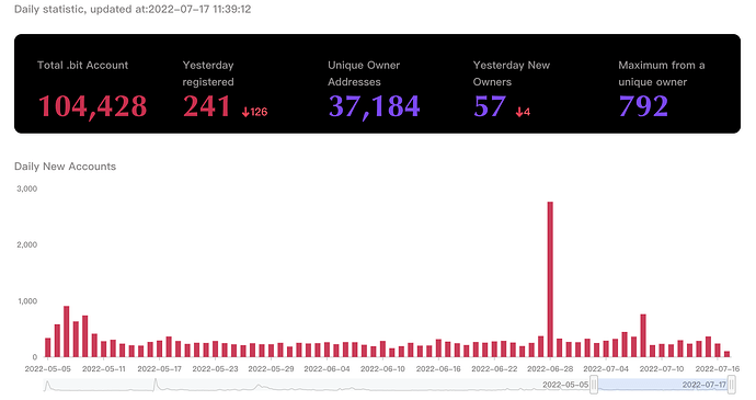 上周全网 .bit 注册账号增加约 1972 个,增加了 604 个新的账号持有者地址(独立Owner)。
