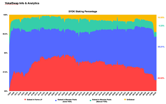 由图中可见, 受目前 YokaiSwap Godwoken v1 迁移影响,目前有大约 16.05% 的 YOK 处于未质押的状态,上一期该值为 6.17% 。