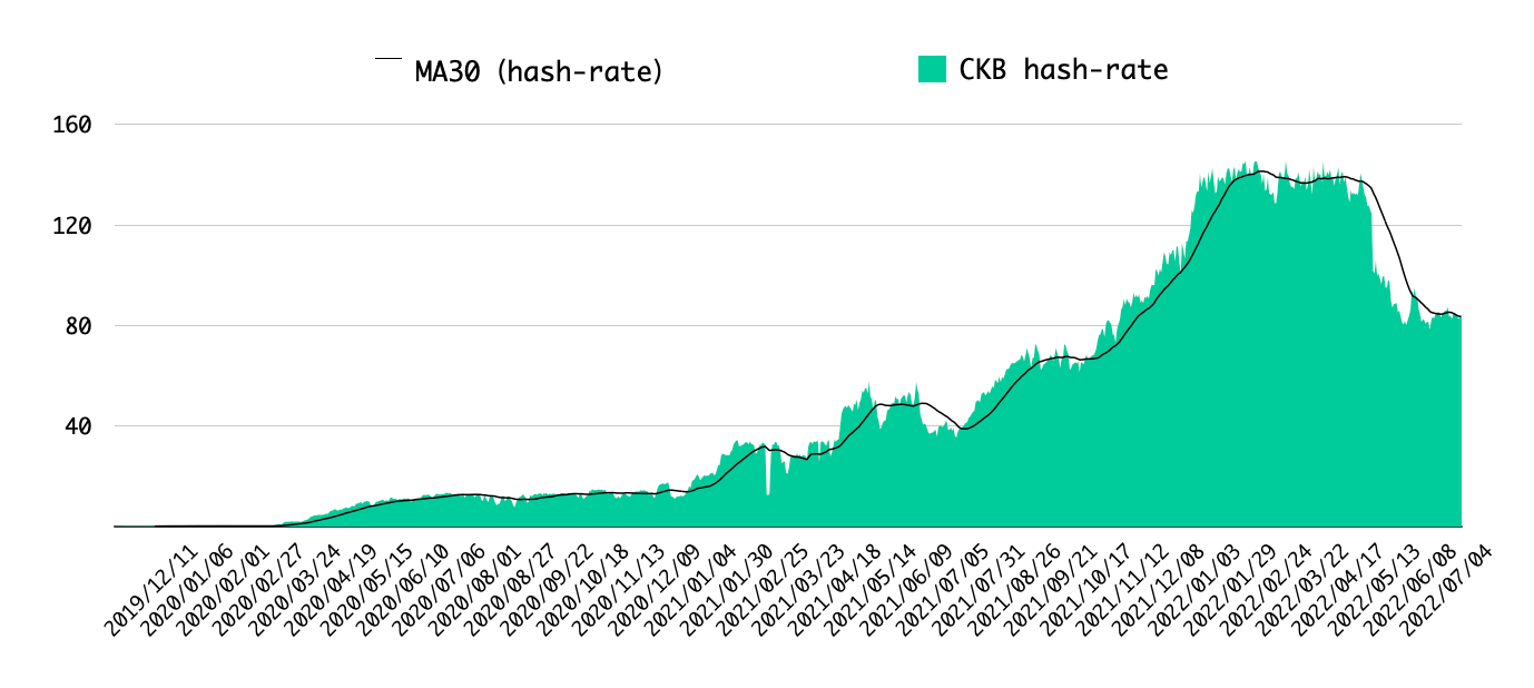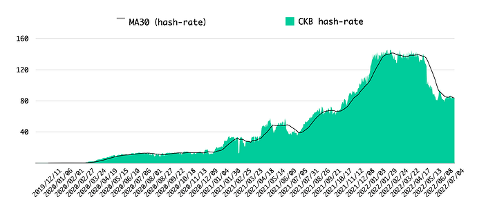 下图是 CKB 主网上线以来的全网算力走势图,从 2019/11/16 至今,算力从最初的 0.073 P 增长至今,期间算力最高的时候超过 150P,算力增长超过 2,000 倍。