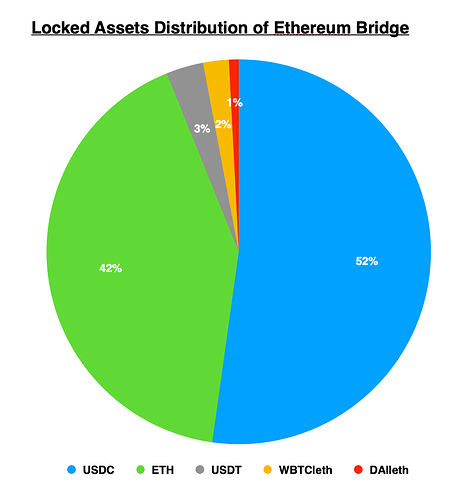 上图显示了 Ethereum 跨链桥上的资产分布情况: 从以太坊跨过来的资产中,USDC 占比为 52%,ETH 占比为 42%。