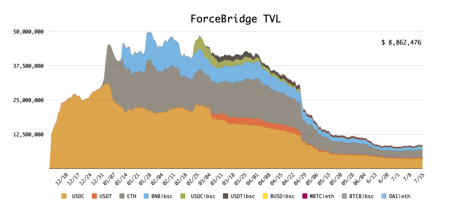 数据方面,截至本刊发布,Force Bridge 上的 TVL 累计为 $8,862,476 ,具体走势如下所示: