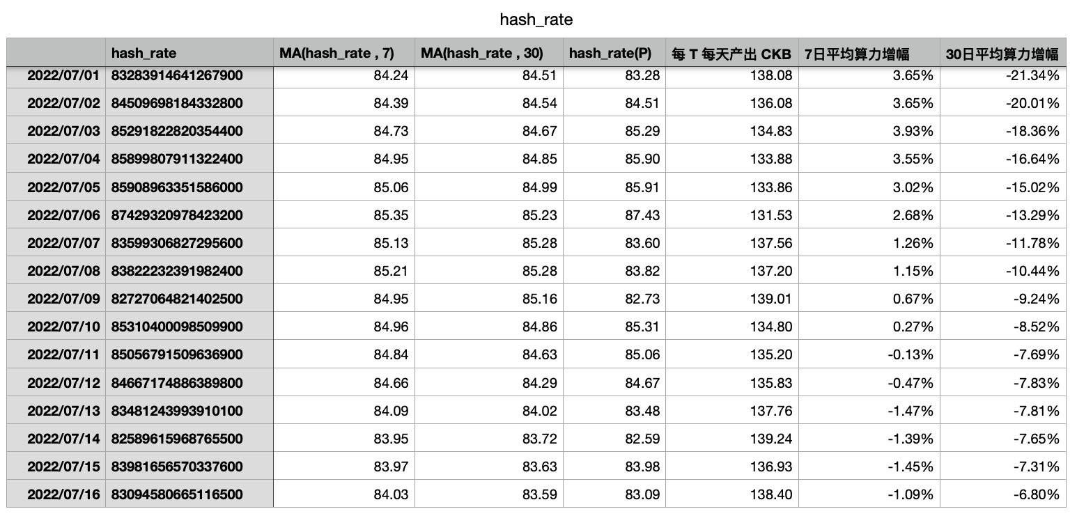 7 日平均算力: 84.03P,( 上期该值为 84.95P ) 最近 7 日平均算力增长幅度:-1.09% 30 日平均算力:83.59P,(上期该值为 85.16P ) 最近 30 日平均算力幅度: -6.80% 每 T 算力产出 CKB 数量:大约 138 枚(*上期该值为 139 CKB * )