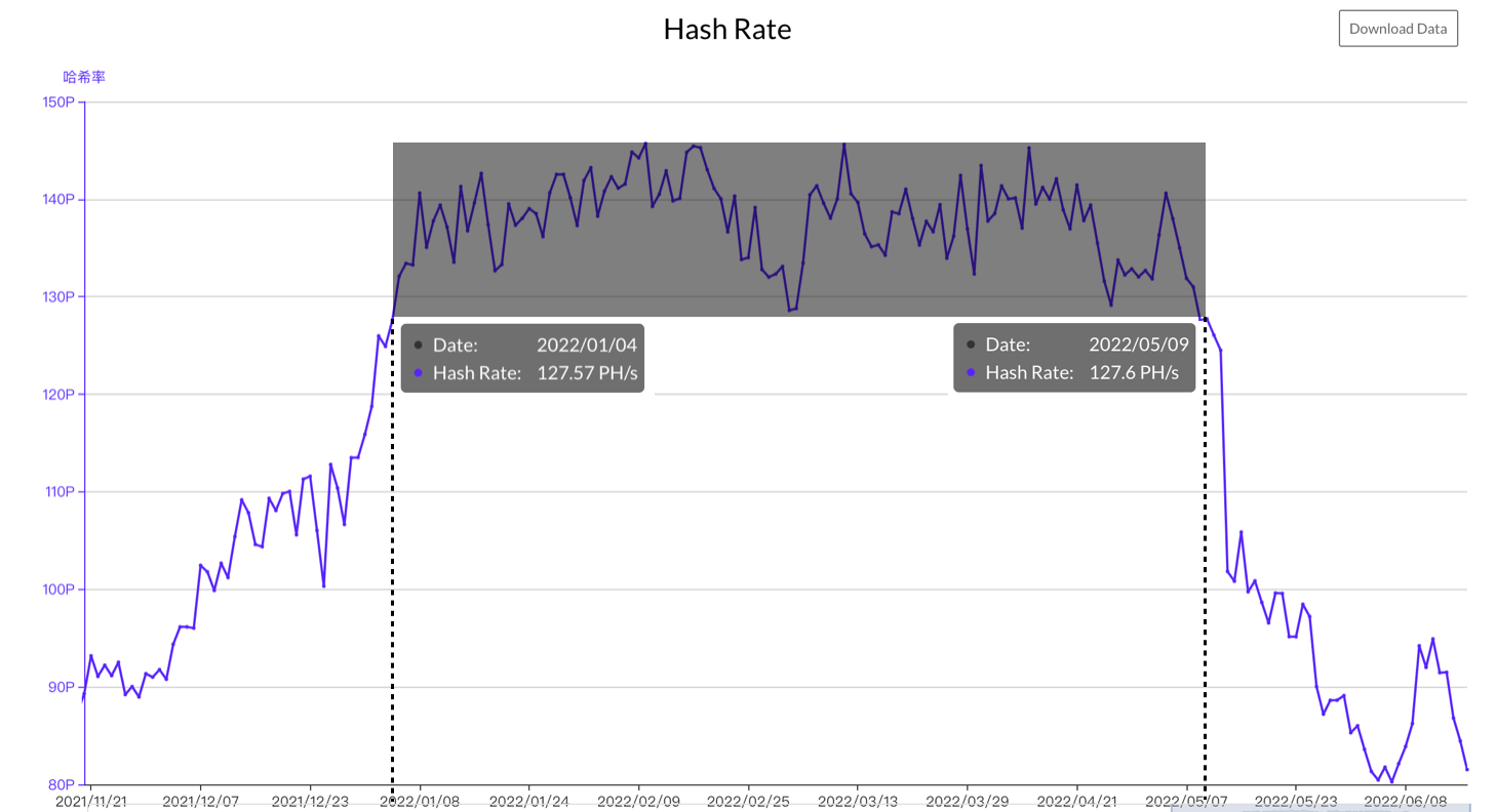 可以看到,从 5 月 9 号开始,全网算力跌破 了维持长达 4 个月之久的顶部算力箱体区域。当时,字节君就判断是触达部分矿工的关机价了,并且这个趋势还会进一步延续,因为自从2021年国内挖矿清退之后,对于普通用户来讲(超级大矿工除外,它们有资源),就很难找到低价电来挖矿,7 毛以上一度电已经算是便宜的了。有一部分矿工是按月提前支付了费用,也就是说到期之后,如果币价还没有明显起色,那么这些矿工还会陆续关机。到六月中旬,一个自然月过去后,剩下来的算力就是那些能拿到低成本的网络算力。