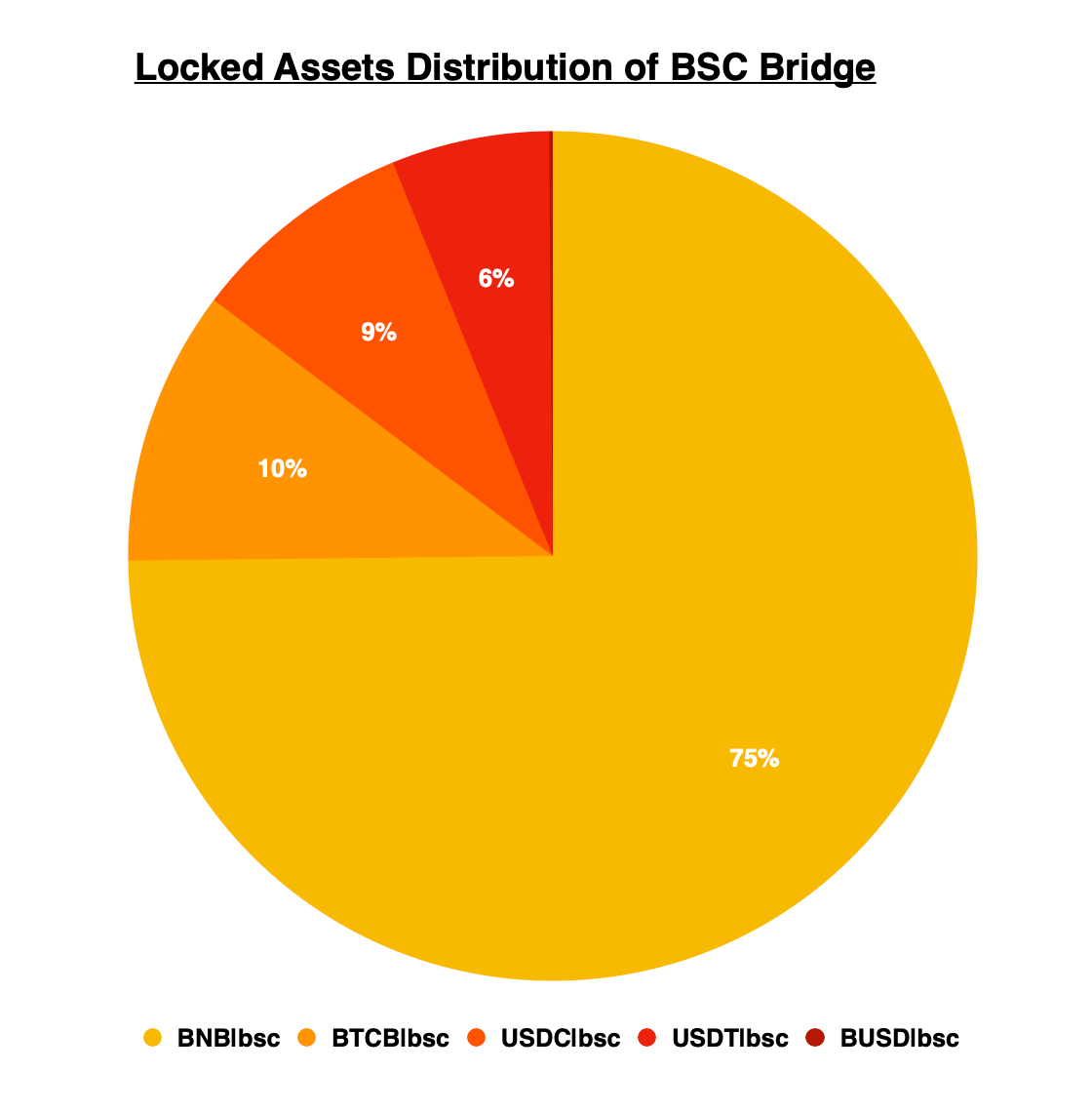 上图显示了 BSC 跨链桥上的资产分布情况: 从 BSC 跨过来的资产中,BNB 占比为 75%,BTCB 占比为 10%,USDC 占比为 9 ,USDT 占比为 8。