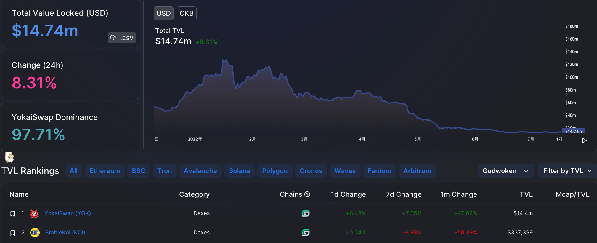 Godwoken 上的更多数据, 可以通过以下链接查看: https://defillama.com/chain/Godwoken 。