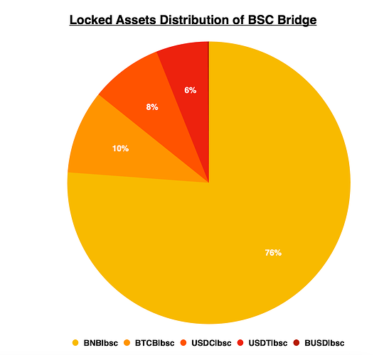 上图显示了 BSC 跨链桥上的资产分布情况: 从 BSC 跨过来的资产中,BNB 占比为 76 ,BTCB 占比为 10,USDC 占比为 8 ,USDT 占比为 6。