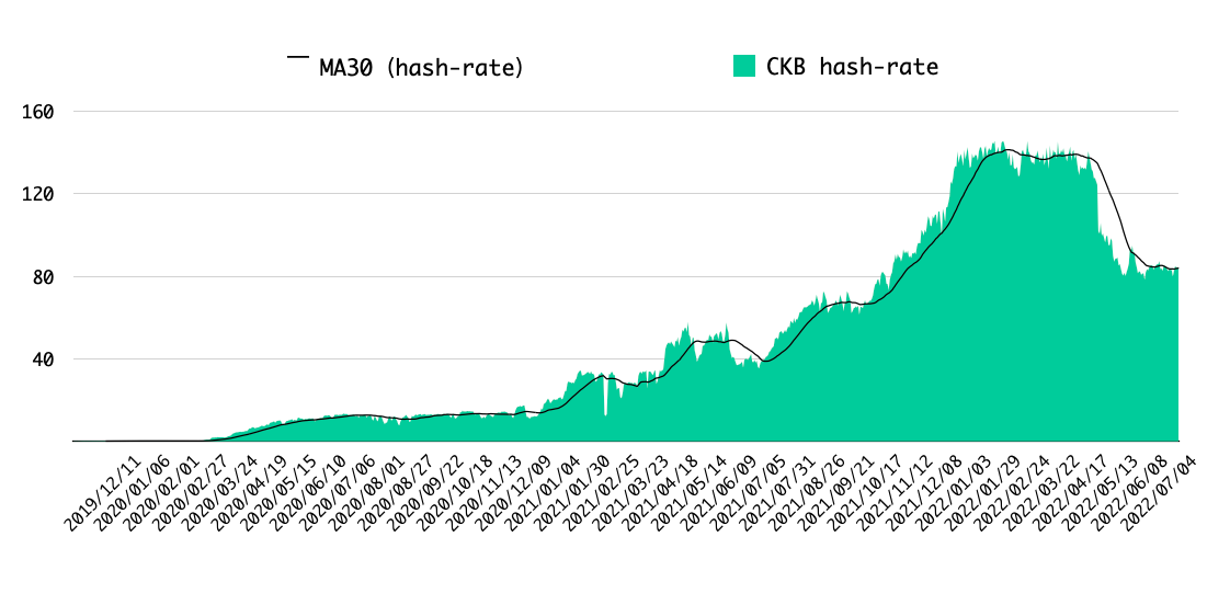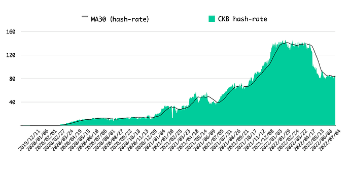 下图是 CKB 主网上线以来的全网算力走势图,从 2019/11/16 至今,算力从最初的 0.073 P 增长至今,期间算力最高的时候超过 150P,算力增长超过 2,000 倍。