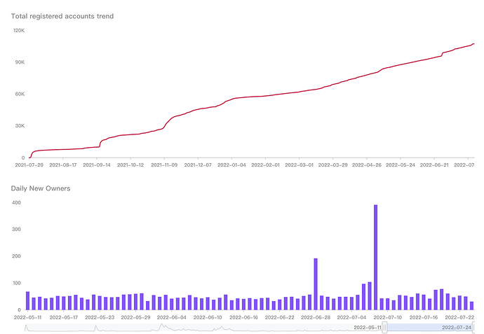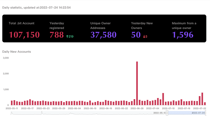 上周全网 .bit 注册账号增加约 2722 个,增加了 396 个新的账号持有者地址(独立Owner)。