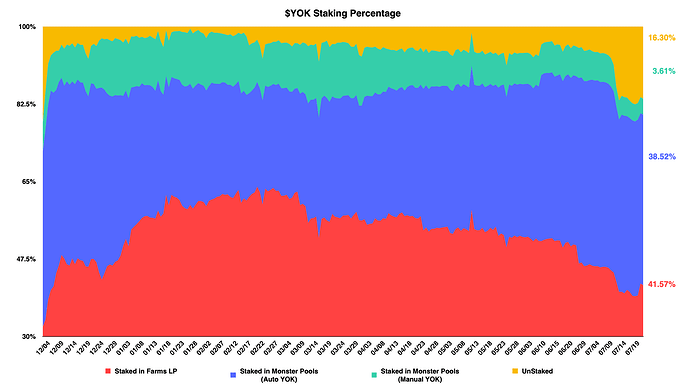 上图为 YokaiSwap 上线以来的质押图,其中红色部分为锁到农场里的 YOK,蓝色为锁定到自动资金池中的 YOK,绿色为锁定到手动资金池中的 YOK,最后黄色这部分为未锁定的 YOK。