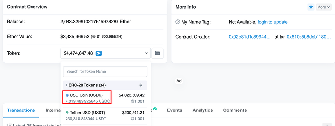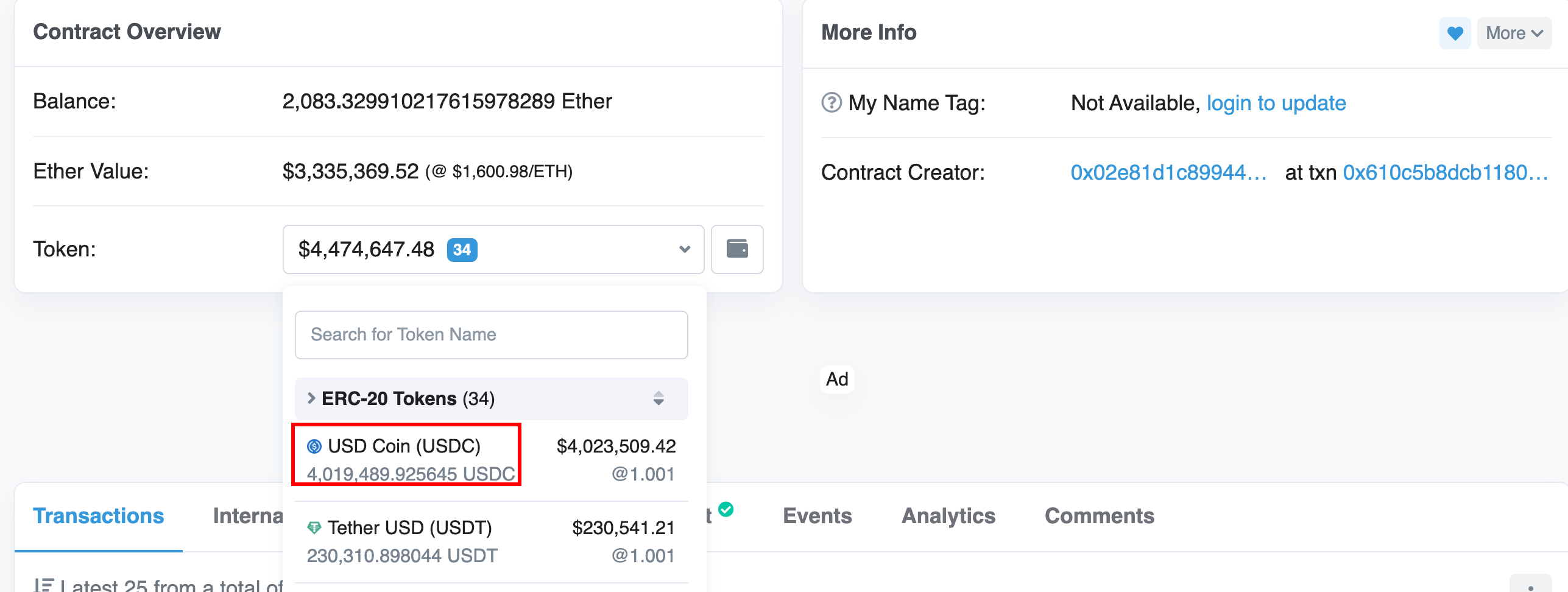 从以太坊跨过来的 ETH 数量为 2,083 枚,从以太坊跨过来的 USDC 为 4,019,489枚。