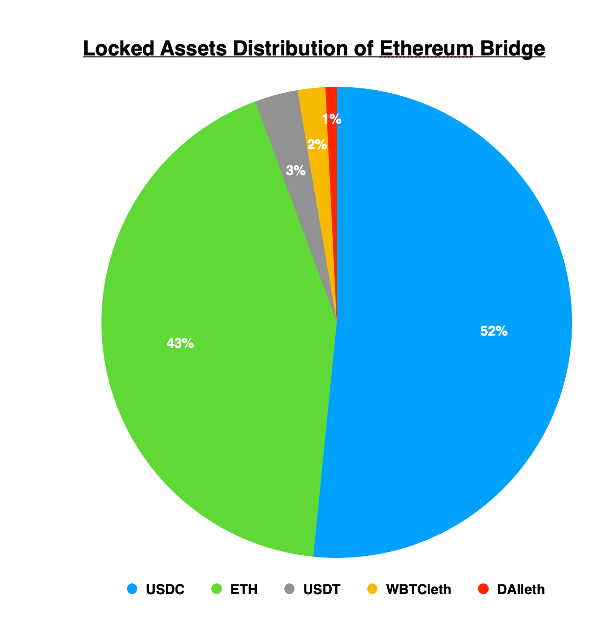 上图显示了 Ethereum 跨链桥上的资产分布情况: 从以太坊跨过来的资产中,USDC 占比为 52%,ETH 占比为 43%。