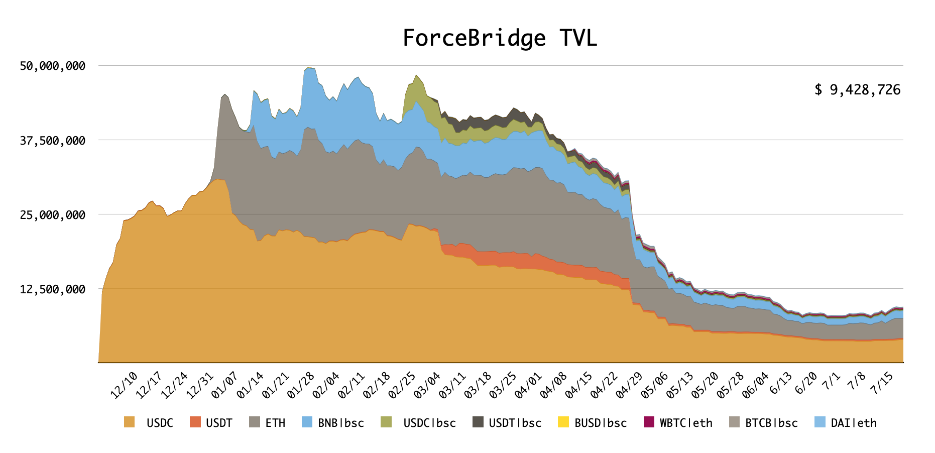 数据方面,截至本刊发布,Force Bridge 上的 TVL 累计为 $9,428,726 ,具体走势如下所示: