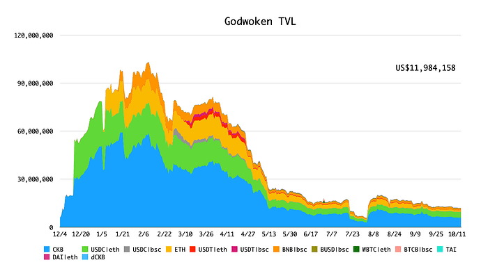 字节君从 Godwoken 的地址上汇总到的 TVL 信息如下( 包含 Godwoken v0 与 v1的数据 )