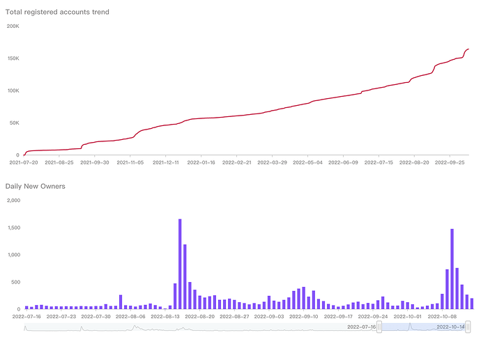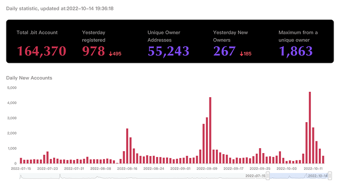 上周全网 .bit 注册账号大幅增长,增加约 13452 个,增加了 4153 个新的账号持有者地址(独立Owner)。