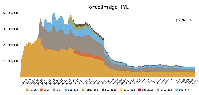 数据方面,截至本刊发布,Force Bridge 上的 TVL 累计为 $ 7,973,923,具体走势如下所示: