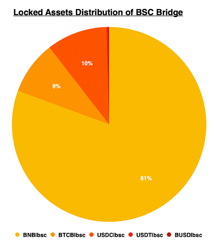 上图显示了 BSC 跨链桥上的资产分布情况: 从 BSC 跨过来的资产中,BNB 占比为 81 ,BTCB 占比为 9 ,USDC 占比为 10 %。