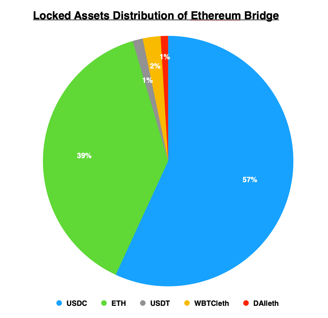 上图显示了 Ethereum 跨链桥上的资产分布情况: 从以太坊跨过来的资产中,USDC 占比为 57%,ETH 占比为 39%。