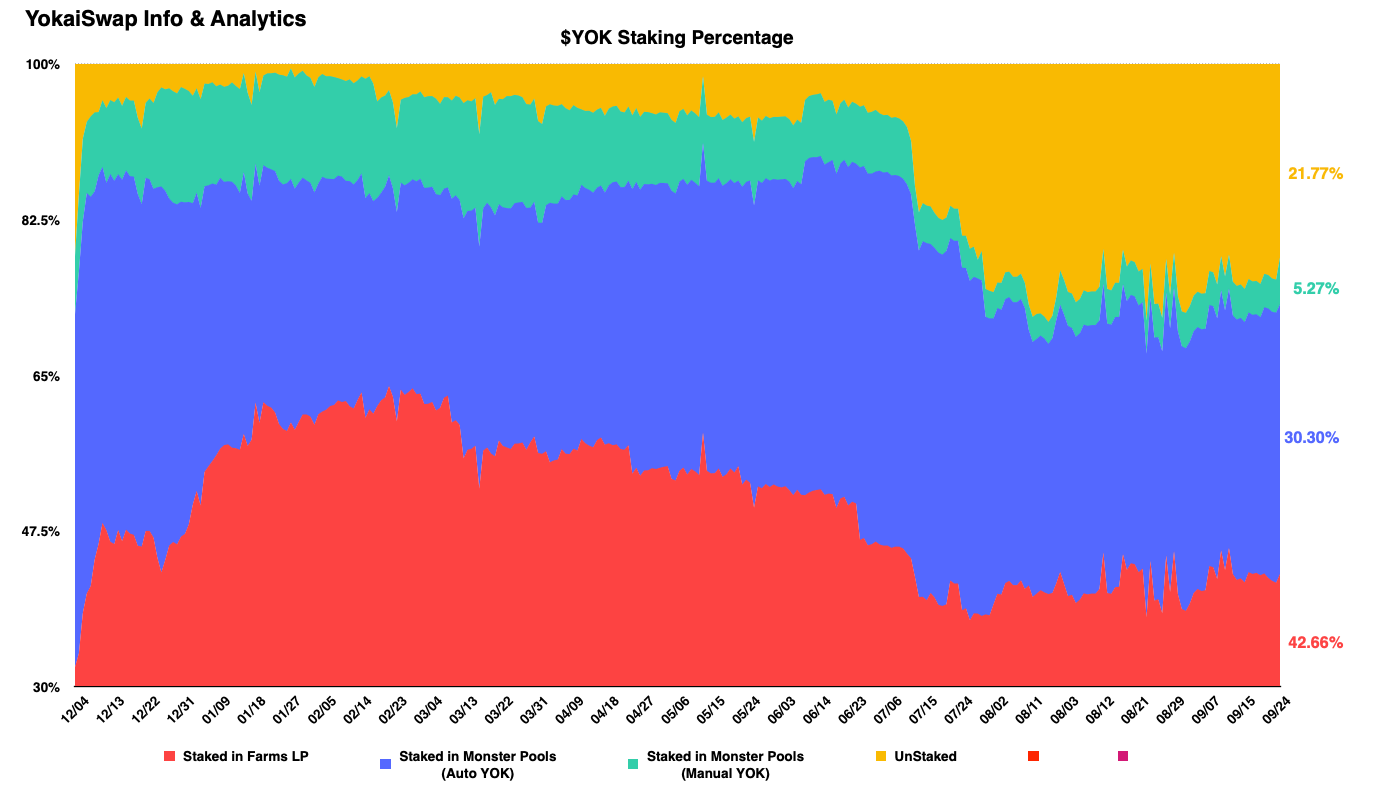 上图为 YokaiSwap 上线以来的质押图,其中红色部分为锁到农场里的 YOK,蓝色为锁定到自动资金池中的 YOK,绿色为锁定到手动资金池中的 YOK,最后黄色这部分为未锁定的 YOK。
