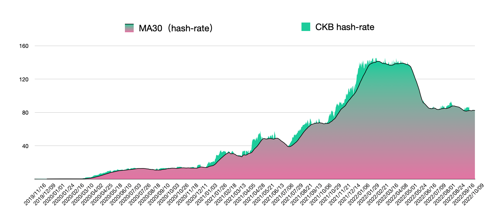 下图是 CKB 主网上线以来的全网算力走势图,从 2019/11/16 至今,算力从最初的 0.073 P 增长至今,期间算力最高的时候超过 150P,算力增长超过 2,000 倍。