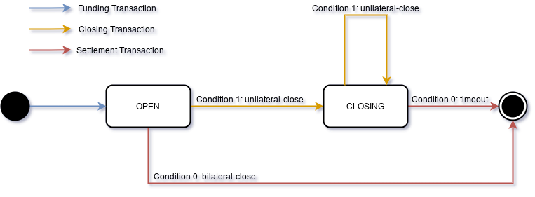 A state transition happens when the GPC lock is unlocked. A GPC lock in state OPEN can be unlocked in one of two conditions, bilateral-close and unilateral-close: (feel free to skip these conditions and come back when you read the ‘Close a channel’ section):