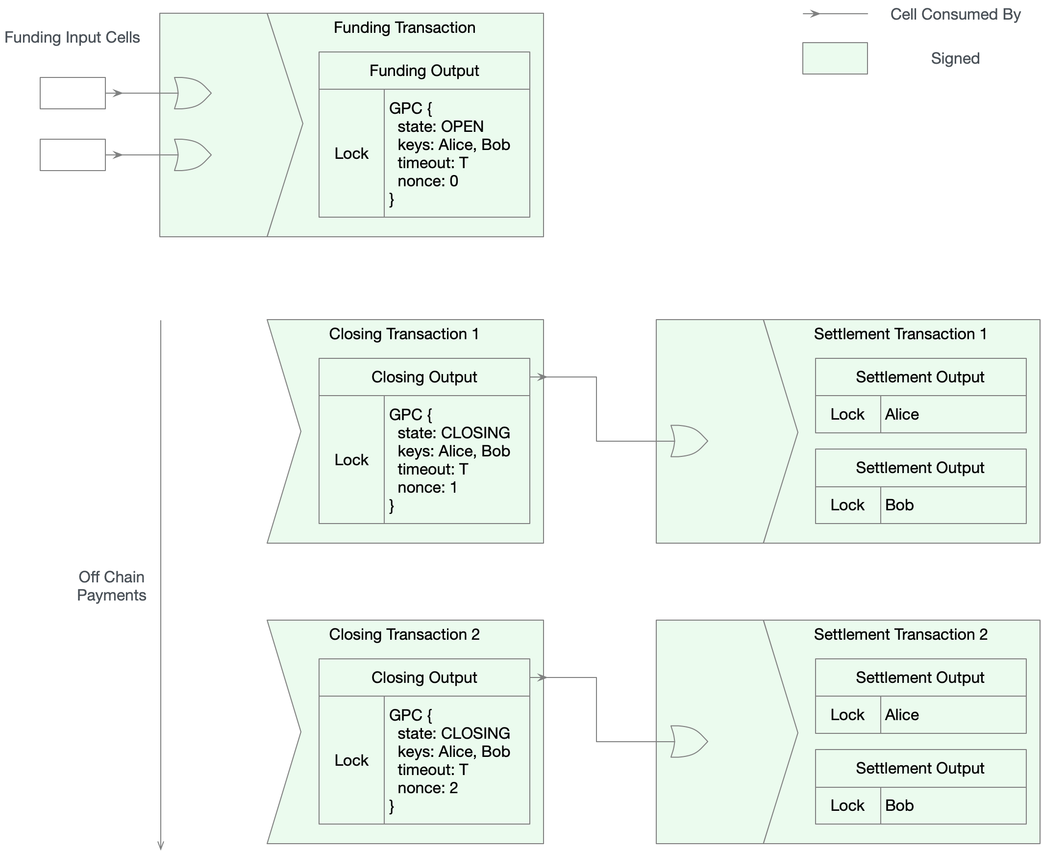 Settlement transaction - A settlement transaction consumes a closing output and closes a GPC channel. It has two outputs that distributes funds to Alice and Bob. It always has a matching closing transaction.