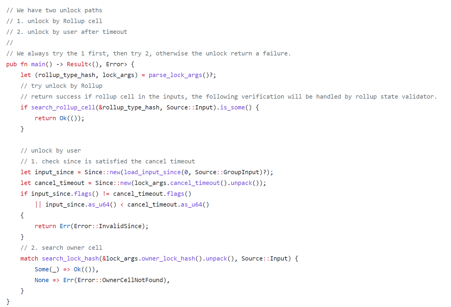 如果采取最简单的判定,只需要检查对应Witness不为且lock不为空即可,由于Witness经过molecule编码以后的模式为 4Bytes的总长度+4bytes的lock_start+4Bytes的input_start+4bytes的output_start+lock数据+input数据+output数据。所以我们只需要从Witness的第四个字节开始,读取八个字节,如果读到的前四个字节小于后四个字节,即可判定为非acp流程。