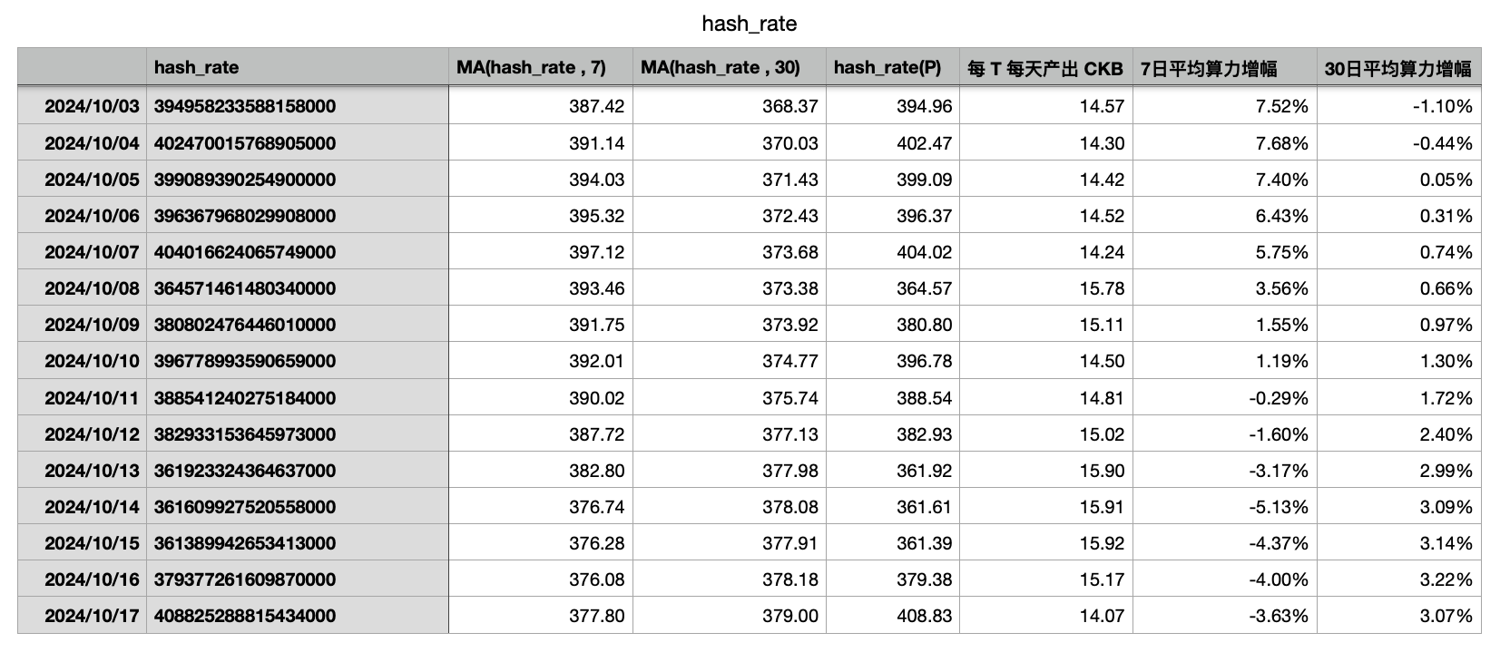 每 T 算力产出 CKB 数量:14.07 枚(上期该值为 15.9 CKB )