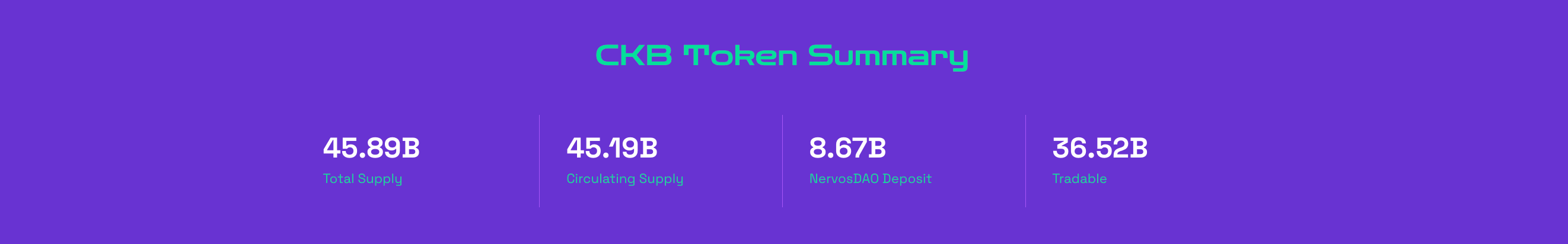 截止发刊, CKB 发行总量为 458.91 亿,流通量为 451.93 亿, NervosDao 锁仓为 86.71 亿枚 CKB。