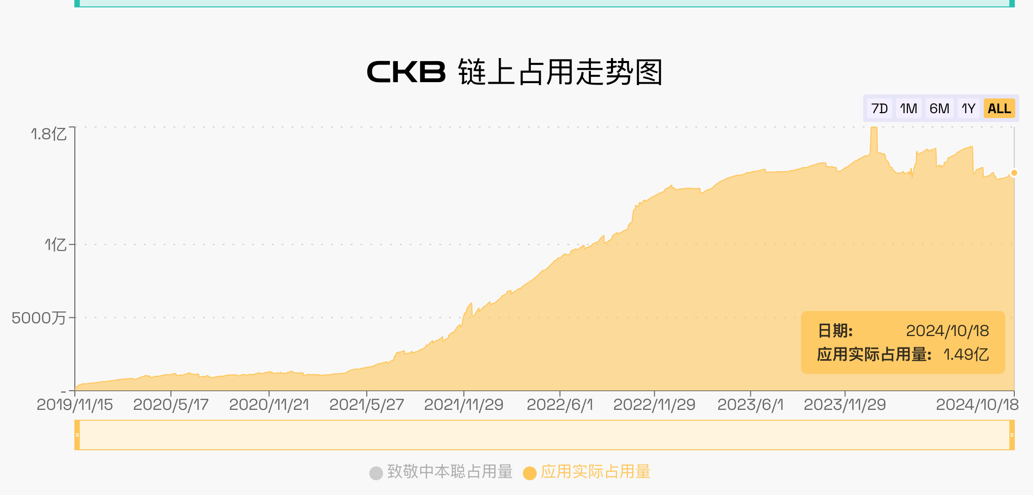 随着 CKB 链上生态的发展,CKB 的实际占用数量将曾增长态势,这意味着 CKB 的流通量会进一步减少。截止 10 月 18 日,CKB 链上应用的实际占用数量为 1.49 亿。