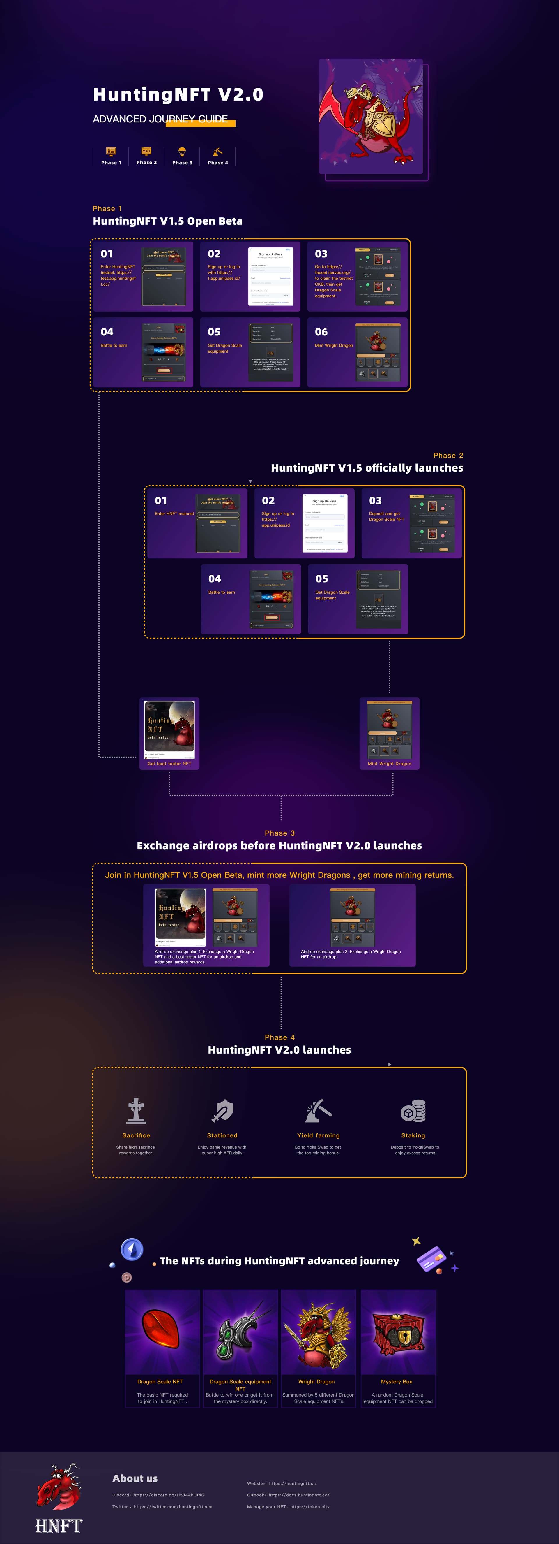 2023 Q1-Q2 HuntingNFT V2.0 is officially launched, open Defense, Sacrifice gameplay. The community launches airdrop exchange activities, players can go to YokaiSwap to participate in trading, yield farming and staking.Economic model operates stably, iterative optimizes game interaction, open multi-dimensional P2E game models.
