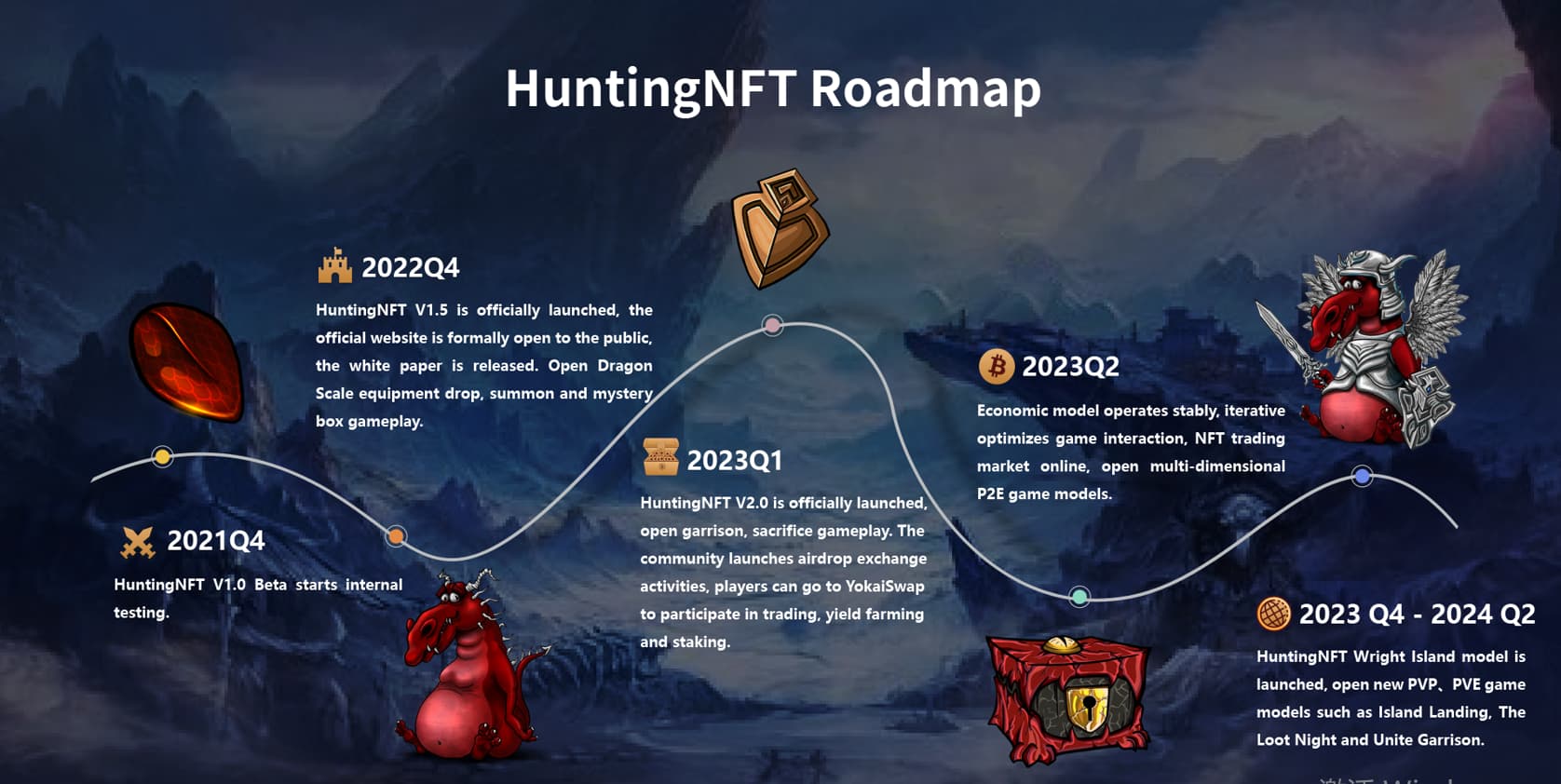 2023 Q3- 2024 Q2 HuntingNFT Wright Island model is launched, opening new PVP、PVE game models such as Island Landing, The Loot Night and Unite Garrison.
