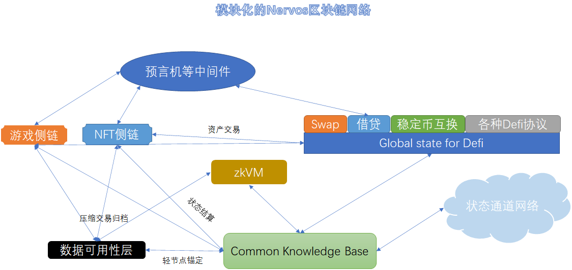 首先,CKB作为最终的结算层,应设计得足够抽象、安全且鲁棒以及足够去中心化,在此之上,首先是模块化的基础设施组件,如已有的Rollup框架Godwoken,正在路上的侧链Axon等,除此之外,模块化区块链网络还需要有足够多的中间件,有的是预言机,有的是链上数据检索,以及数据可用性解决方案等。
