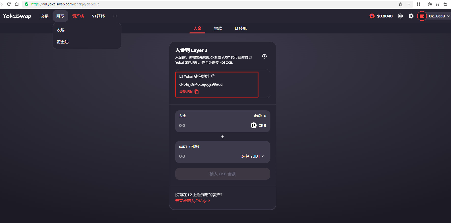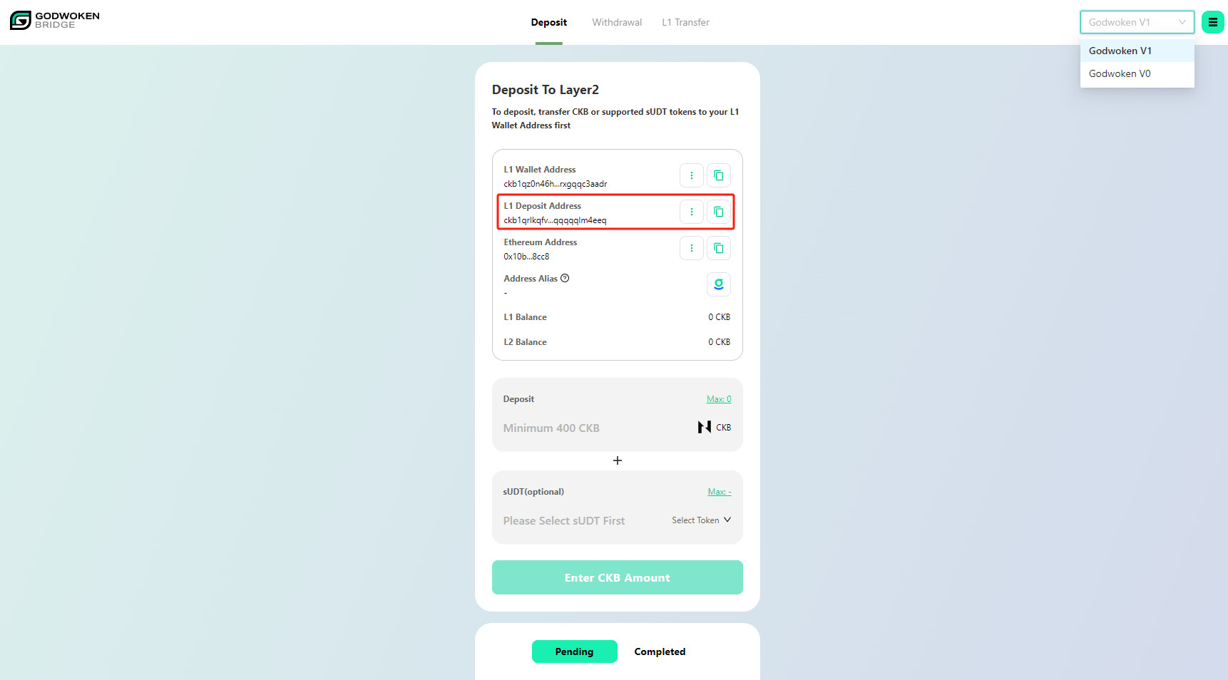 资产标签界面:“跨层(自动切换至Godoken)”:"Layer 1(sUDT.Nervos(GodWoken))"⇄ “sUDT.GodWoken(ETH地址)”