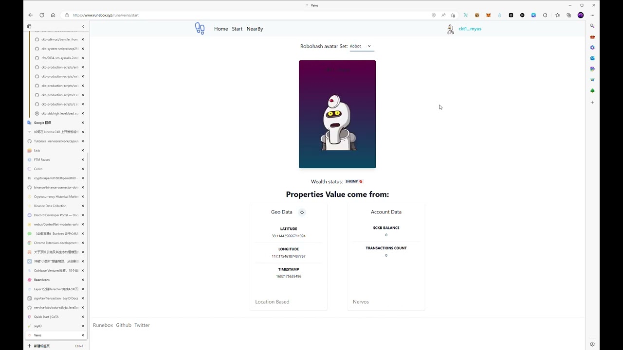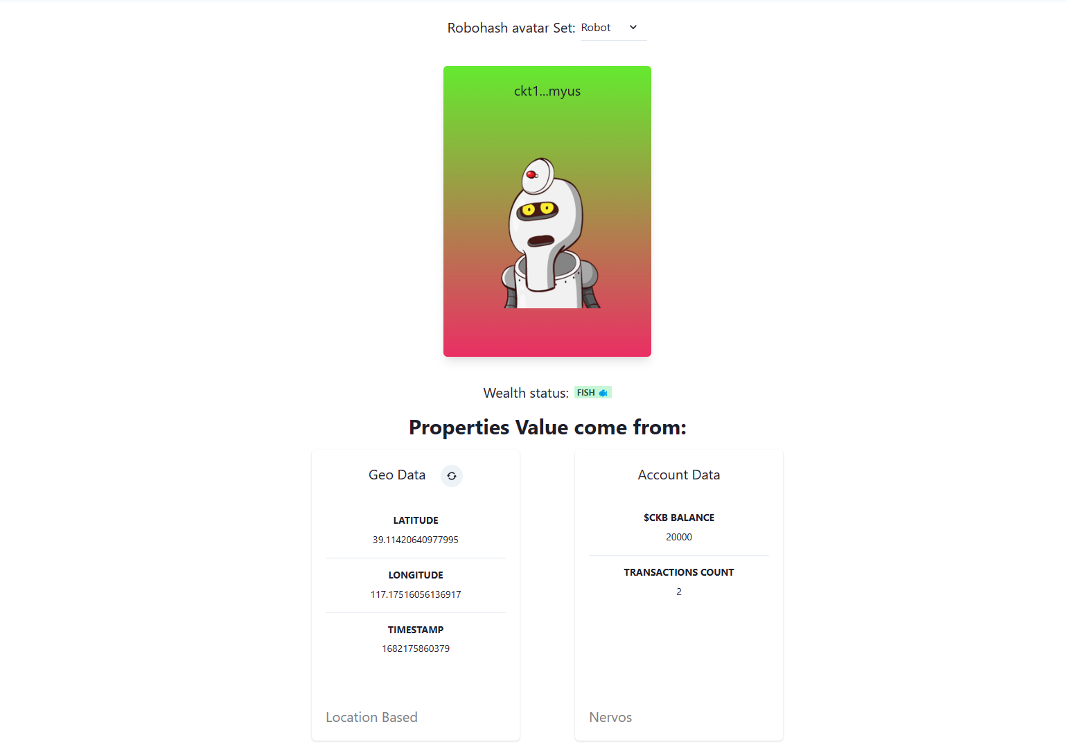 - 连接 JoyID 之后,可以拿到地址(由此确定Robohash的头像);再由地址可以拿到CKB余额和Tx数。CKB余额怎么处理,可以参考后面的恶趣味部分。