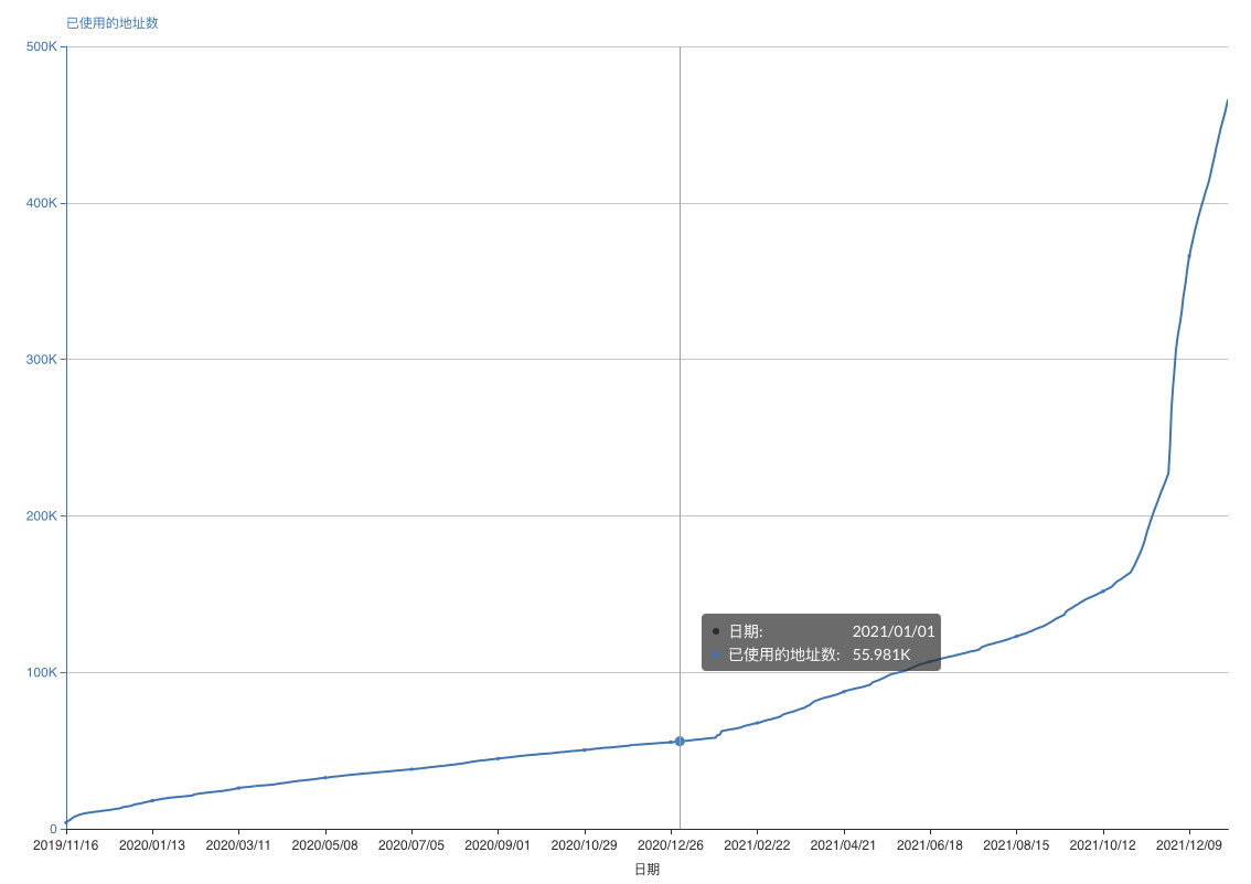2021 年初,已使用的 CKB 地址数为 55981,到年末的时候,这个数据为 450959,增长了 7 倍。