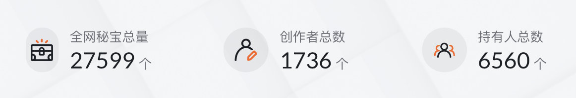 截至写文时,秘宝平台的创作者达到了 1736 位,全网秘宝 NFT 总量为 27599 个,持有秘宝 NFT 的地址数为 6560 个。